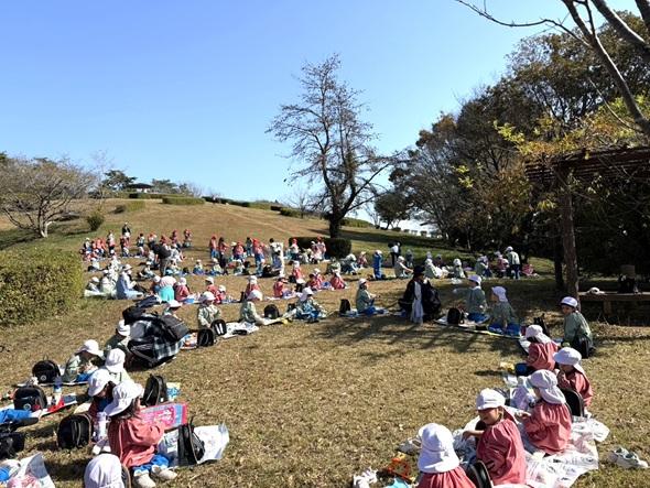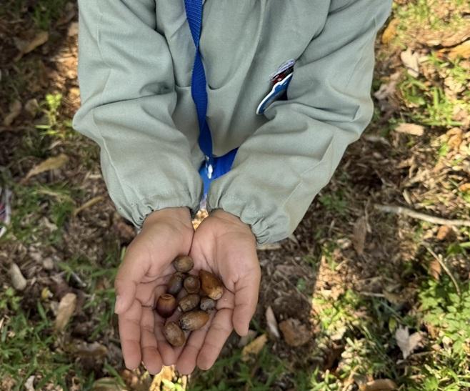 みんなでお弁当を食べた後は、草の上をごろごろと寝転がったり、まつぼっくりを集めて遊びました。