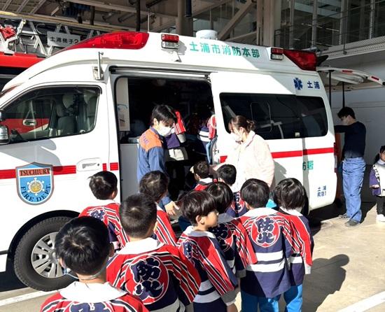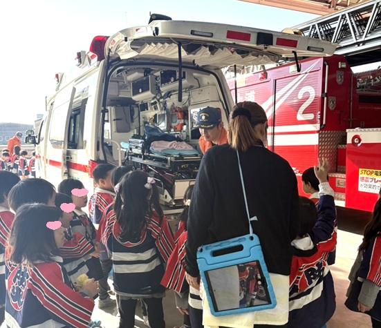 救急車、ポンプ車、タンク車、レスキュー車など沢山の車があり、救急車には実際に乗り込んで見せてもらいました。