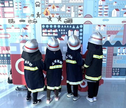 ユニフォームを着て、ヘルメットをかぶせてもらい、小さな消防士さんの誕生です👩🚒